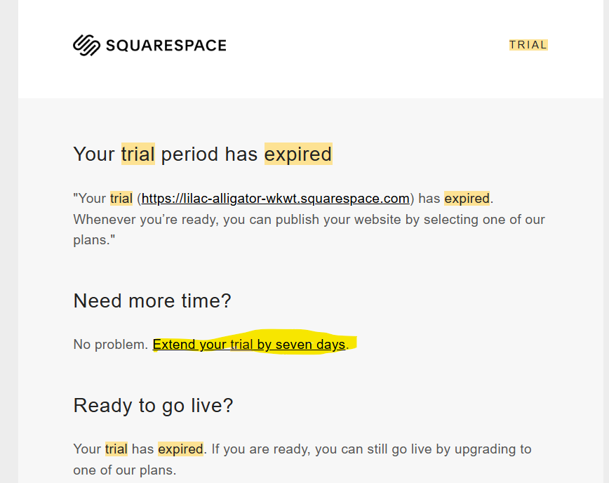 When your trial is close to ending, Squarespace sends an email with the subject line like: “Your Squarespace trial is ending soon” Open this email and scroll to the bottom. You’ll often see a link or button that says: “Need more time?” or “Extend your trial” Clicking this will automatically add extra days to your trial—usually 7 days.
